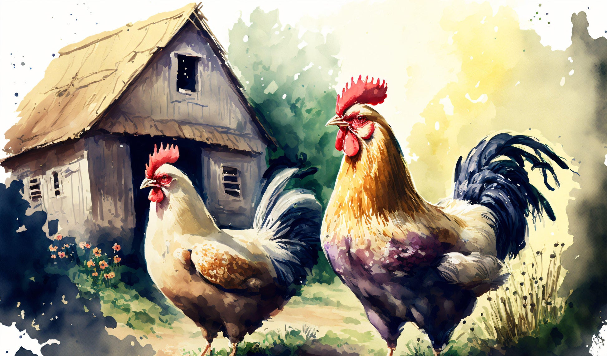 Description: This piece of art captures the charming simplicity of farm life with two colorful chickens on a farm. The chickens are depicted in a whimsical watercolor style, with bright, bold colors and loose brushstrokes. The background is also in watercolor style, with soft, muted colors that give the piece a sense of tranquility. The colors used are playful and vibrant, creating a peaceful and happy atmosphere. This piece of art is perfect for those who love animals, nature, and the countryside. It can be a great addition to any room in need of a touch of color and joy.