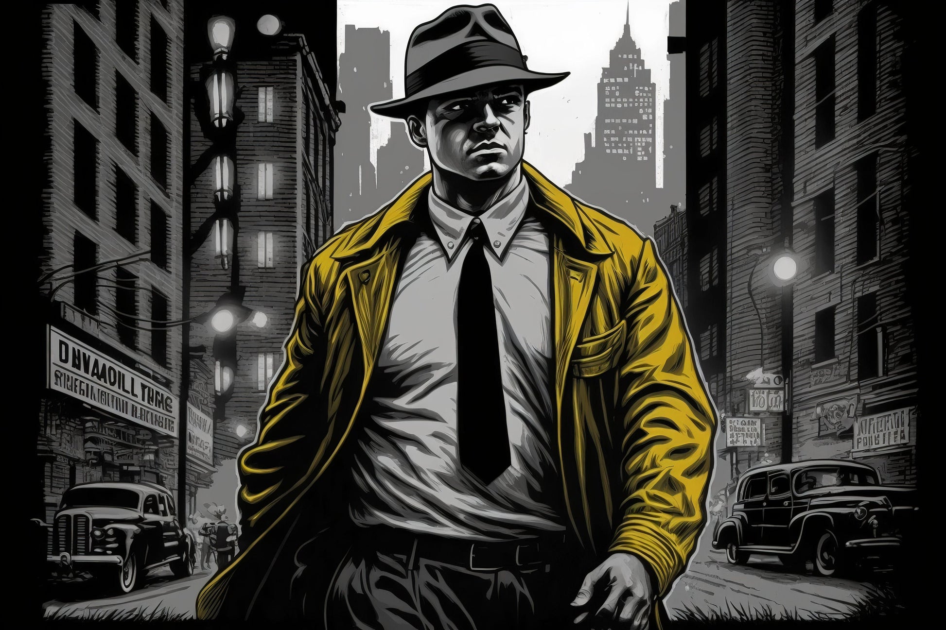 Description: The artwork depicts a scene in the style of classic film noir, featuring a mysterious and intriguing man, with the only touch of color being his eye-catching yellow coat. The man is depicted in monochromatic black and white, set against a dark and atmospheric background. The stark contrasts and dramatic lighting of the piece evoke the moody and suspenseful atmosphere of classic film noir, with the man's enigmatic expression hinting at the secrets and intrigue that define the genre. The yellow coat serves as a bold and striking contrast to the monochromatic palette of the piece, drawing the viewer's gaze to the focal point of the composition. The overall effect is one of a stylish and captivating depiction of the classic film noir aesthetic, inviting the viewer to imagine themselves transported to a world of shadowy alleys, smoky jazz clubs, and dangerous dealings.