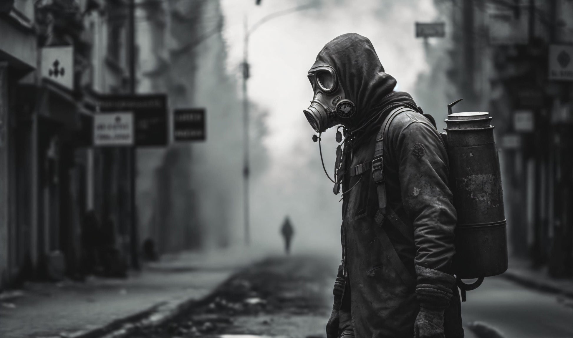 Description: The artwork portrays a man standing in the midst of a desolate post-apocalyptic city. He wears a gas mask, hinting at the harsh and inhospitable environment he inhabits. The piece is rendered in black and white, emphasizing the bleakness and desolation of the surroundings. Despite the absence of color, the details of the man's attire and the surrounding environment are strikingly realistic, creating a sense of tension and foreboding in the viewer. The piece is a haunting reminder of the potential consequences of human actions and the importance of safeguarding our world.