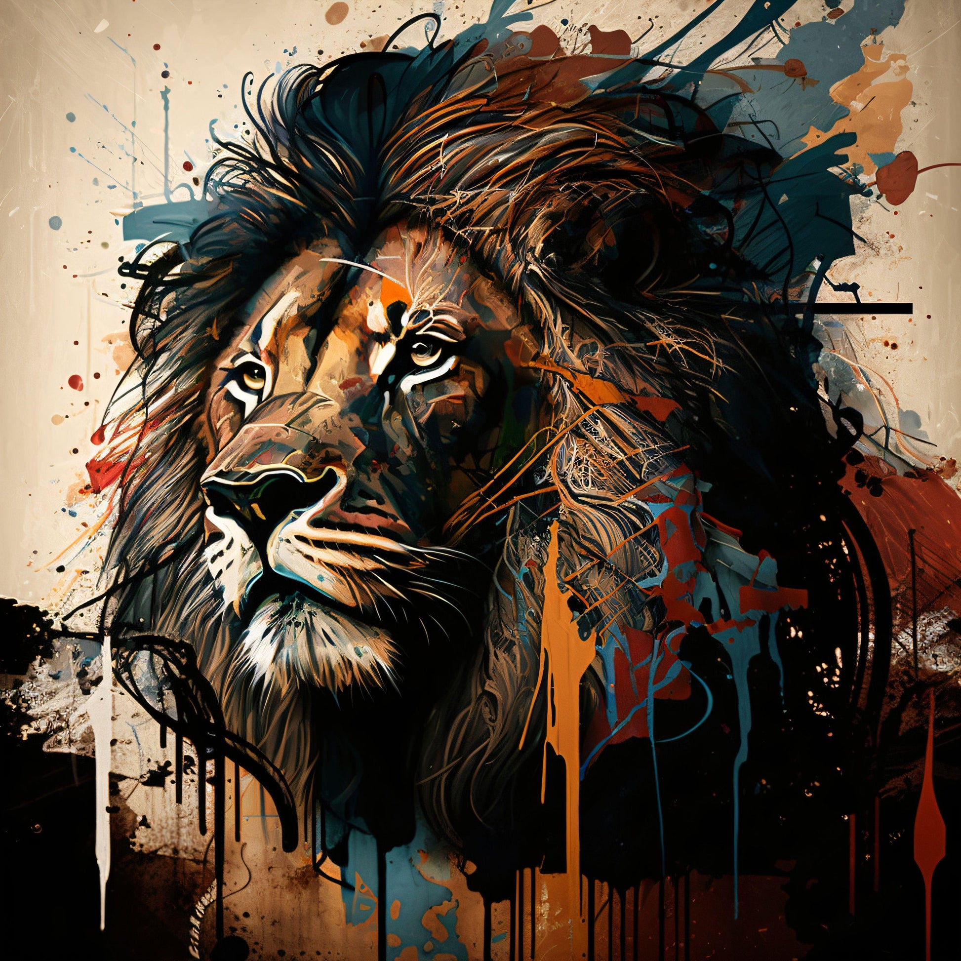 Description: The artwork depicts a portrait of a lion, rendered in an abstract style. The bold lines and rich, saturated colors convey the strength and power of this magnificent animal, while the abstract style adds a sense of movement and energy to the composition. The lion's mane is depicted in thick, textured strokes, capturing the wildness and ferocity of this apex predator. The background is left intentionally minimal, allowing the lion to take center stage. The overall effect is one of a powerful and striking depiction of this iconic animal, capturing its beauty, strength, and majesty in a unique and captivating way. The painting invites the viewer to appreciate the raw power and grace of the lion, and to see this magnificent animal in a new and exciting light.