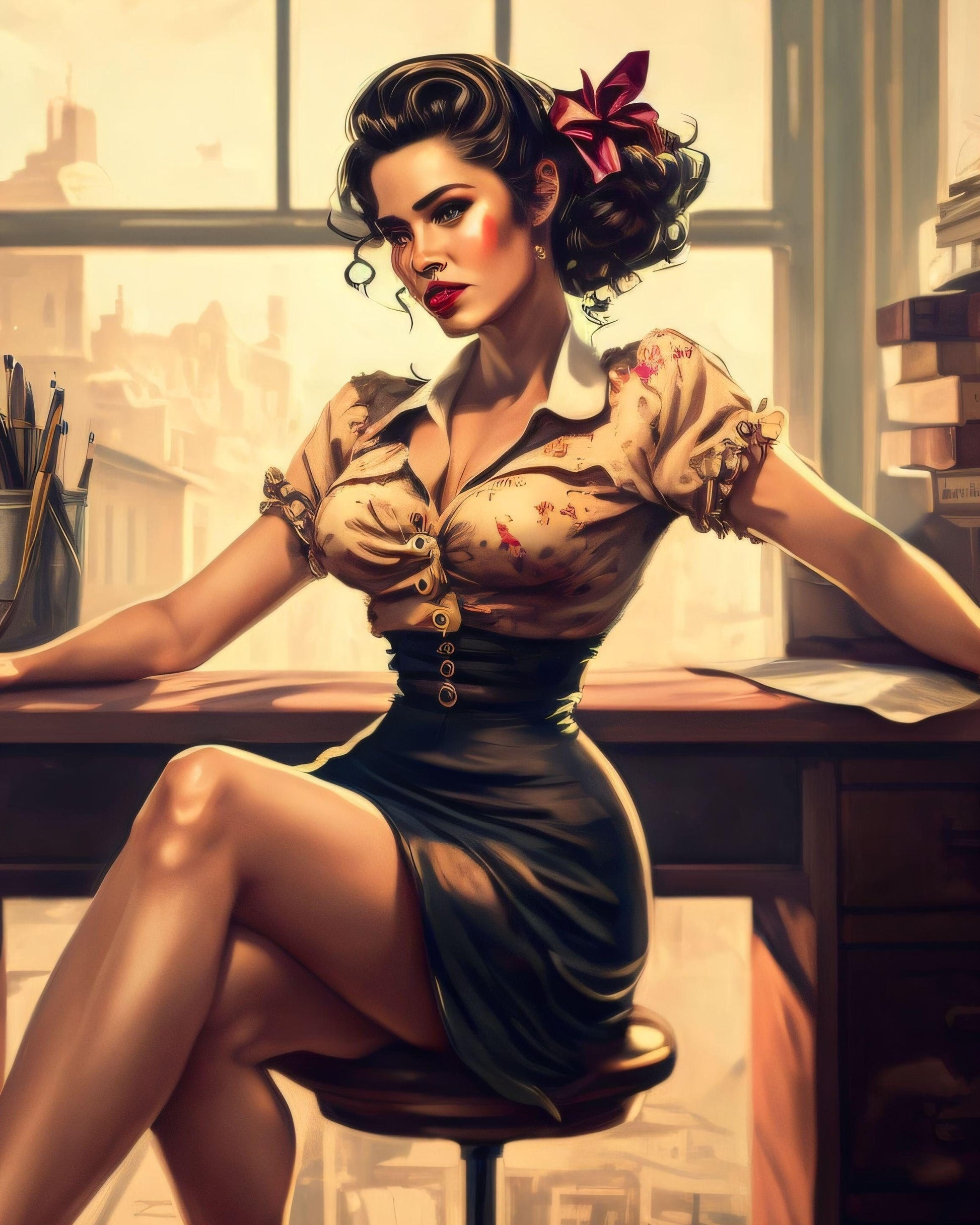 Pin-Up Girl in Office - Canvas, Metal, Acrylic, Framed, or Giclee Print